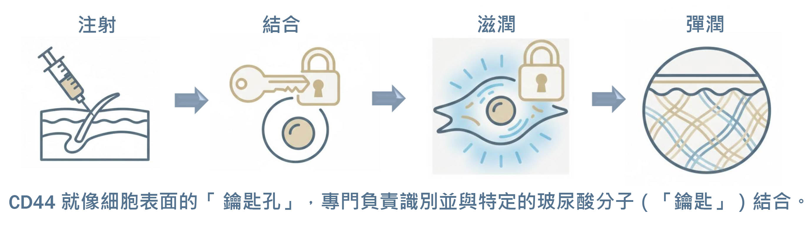 一般的玻尿酸若分子量不對,只能做到表層補水。Doublyx EVO 專利的分子量區間,是真皮層中 CD44 受體 的專屬鑰匙。