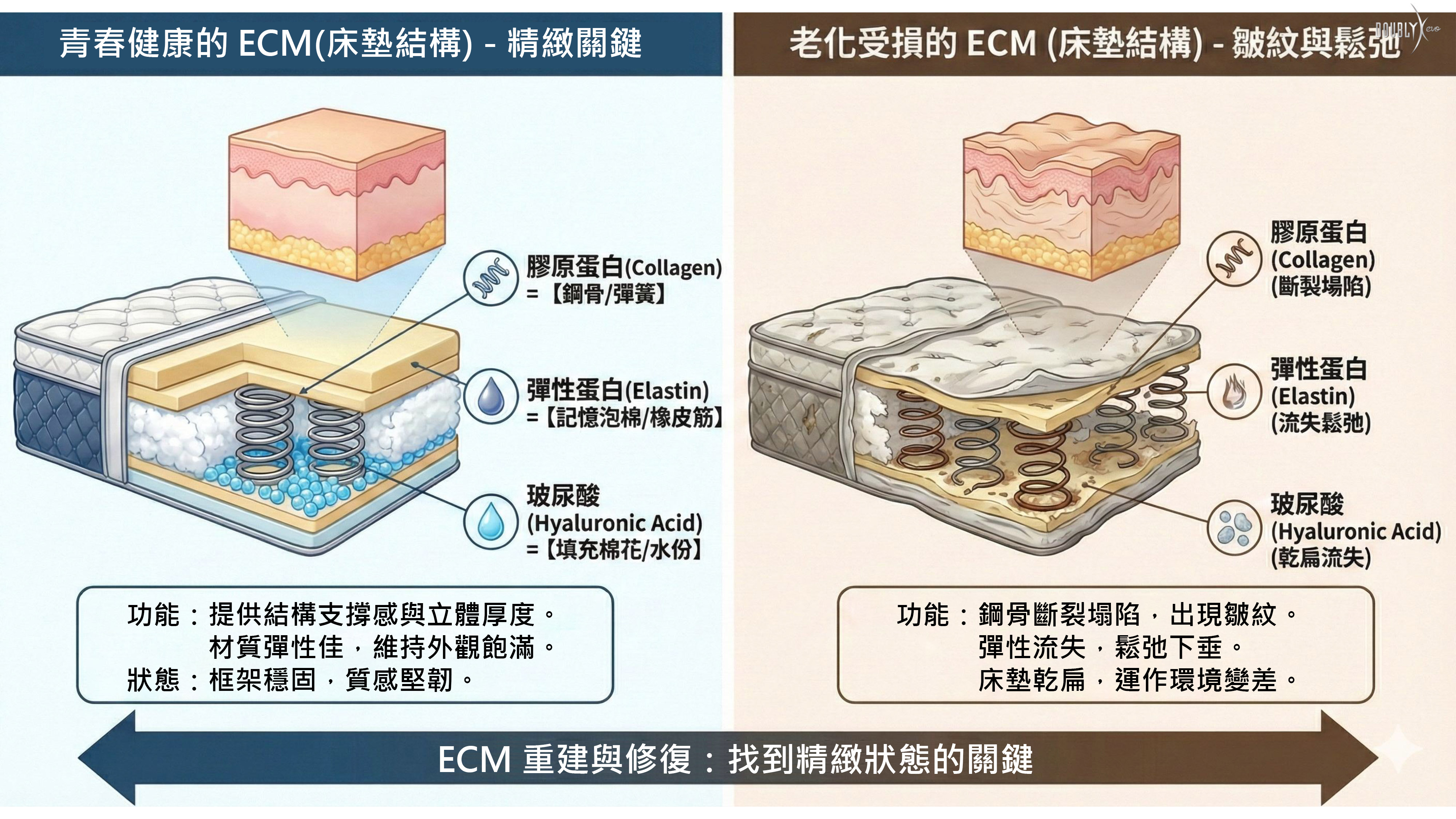其實,是細胞外基質 (ECM) 的支撐結構像「舊床墊」一樣塌陷了。