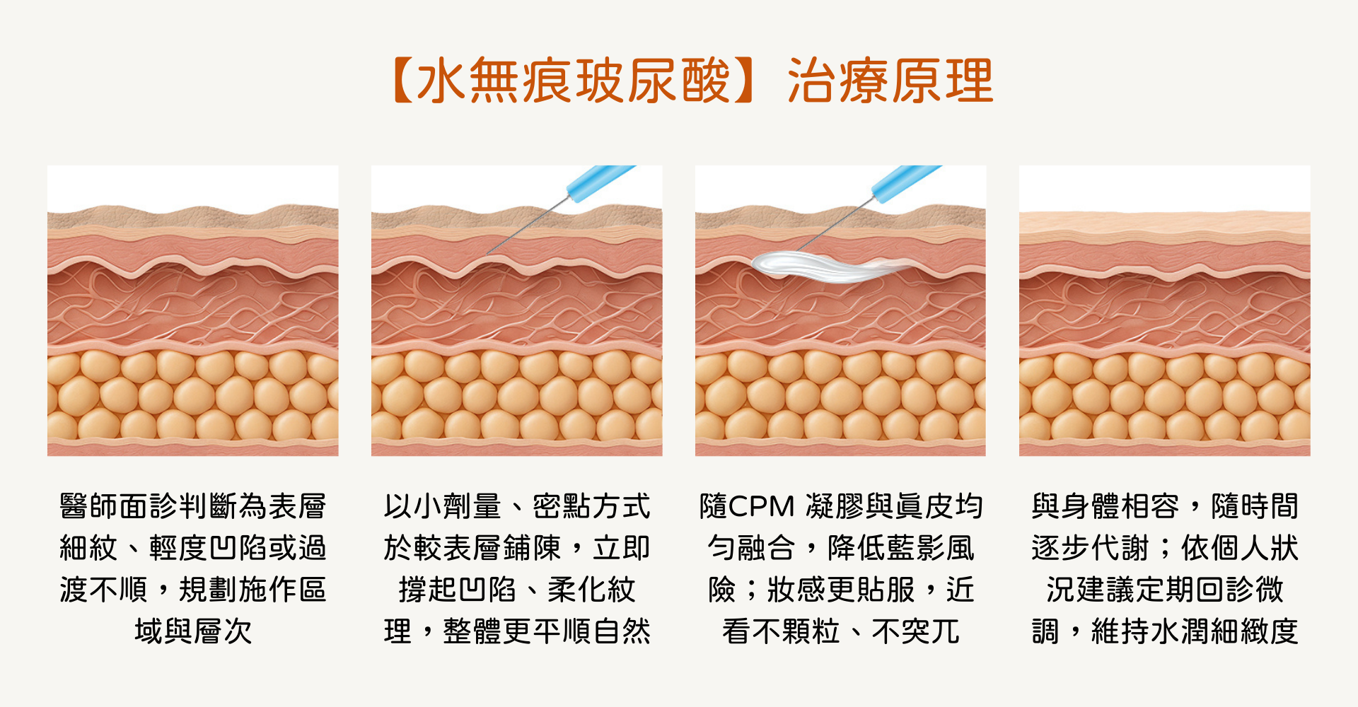 廷德爾效應是指表層過淺注射可能出現的藍灰陰影。水無痕因與皮膚融合度高、分布均勻,在正確層次與手法下可相對降低該狀況。