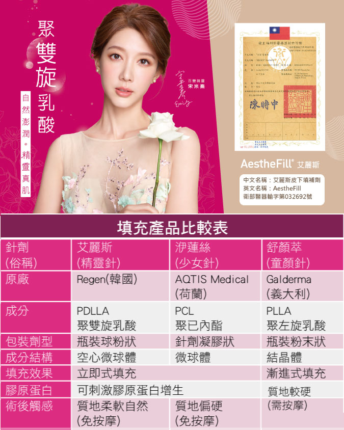 臉部凹陷讓人看起來無精打采又顯老,所以很多人為了讓臉部看起來澎潤有朝氣,會選用不同的填充物來填補凹陷,例如常見的玻尿酸、3D 聚左旋乳酸(童顏針)、微晶瓷、洢蓮絲等填充劑。而艾麗斯 AestheFill 聚雙旋乳酸 PDLLA,被稱為「第三代童顏針」、「精靈針」,能夠填補皺紋凹陷處,並刺激人體的膠原蛋白增生。